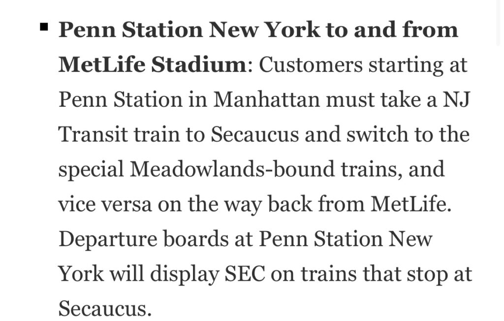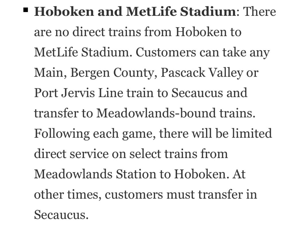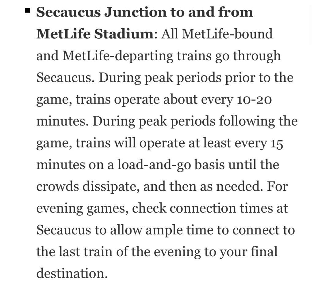 “Rail service will operate approximately four hours prior to kickoff and up to three hours following completion of the game,” NJ Transit said in a statement.