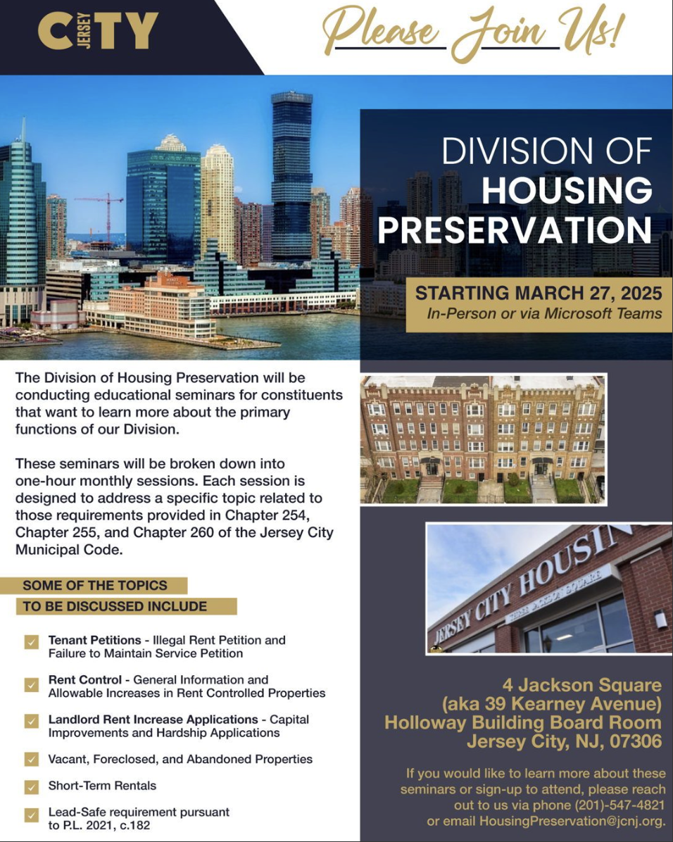 The Jersey City Division of Housing Preservation will be hosting educational seminars for community members who want to learn more about the primary functions of their Division. The classes begin on March 27.