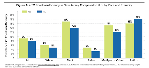 Las disparidades en la inseguridad alimentaria en el estado no solo son geográficas, sino que también son demográficas, con tasas desproporcionadas de inseguridad alimentaria a lo largo de líneas raciales y étnicas. Un análisis de la Encuesta de Pulsos de los Hogares del Censo realizada por el FRAC muestra que en 2021, el 14 por ciento de los hogares negros y el 18 por ciento de los hogares latinos en Nueva Jersey se vieron afectados por la inseguridad alimentaria en comparación con el 5 por ciento de los hogares blancos.