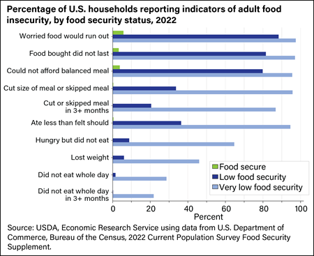 El Departamento de Agricultura de los Estados Unidos define la inseguridad alimentaria como la falta de “acceso por parte de todas las personas en todo momento a suficientes alimentos para una vida activa y saludable”. Específicamente, distingue entre diferentes rangos de seguridad alimentaria (marginal y alta) e inseguridad alimentaria (muy baja y baja). El USDA también hace una clara distinción entre la “inseguridad alimentaria”, una “condición económica y social a nivel de hogar de acceso limitado o incierto a alimentos adecuados” y “hambre”, como “una condición fisiológica a nivel individual que puede ser el resultado de la inseguridad alimentaria”.