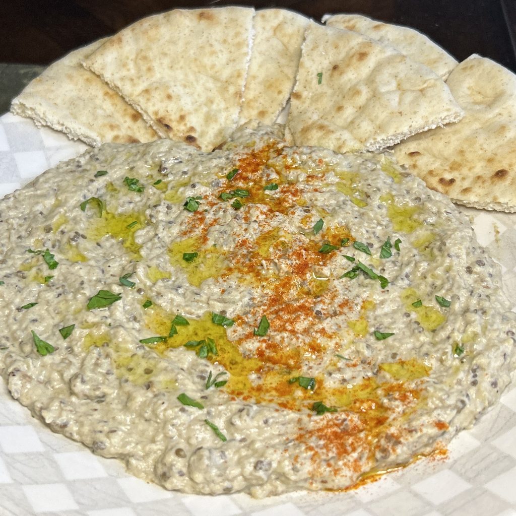 It is then combined with garlic, lemon juice and optionally other spices and served with warm pita bread.