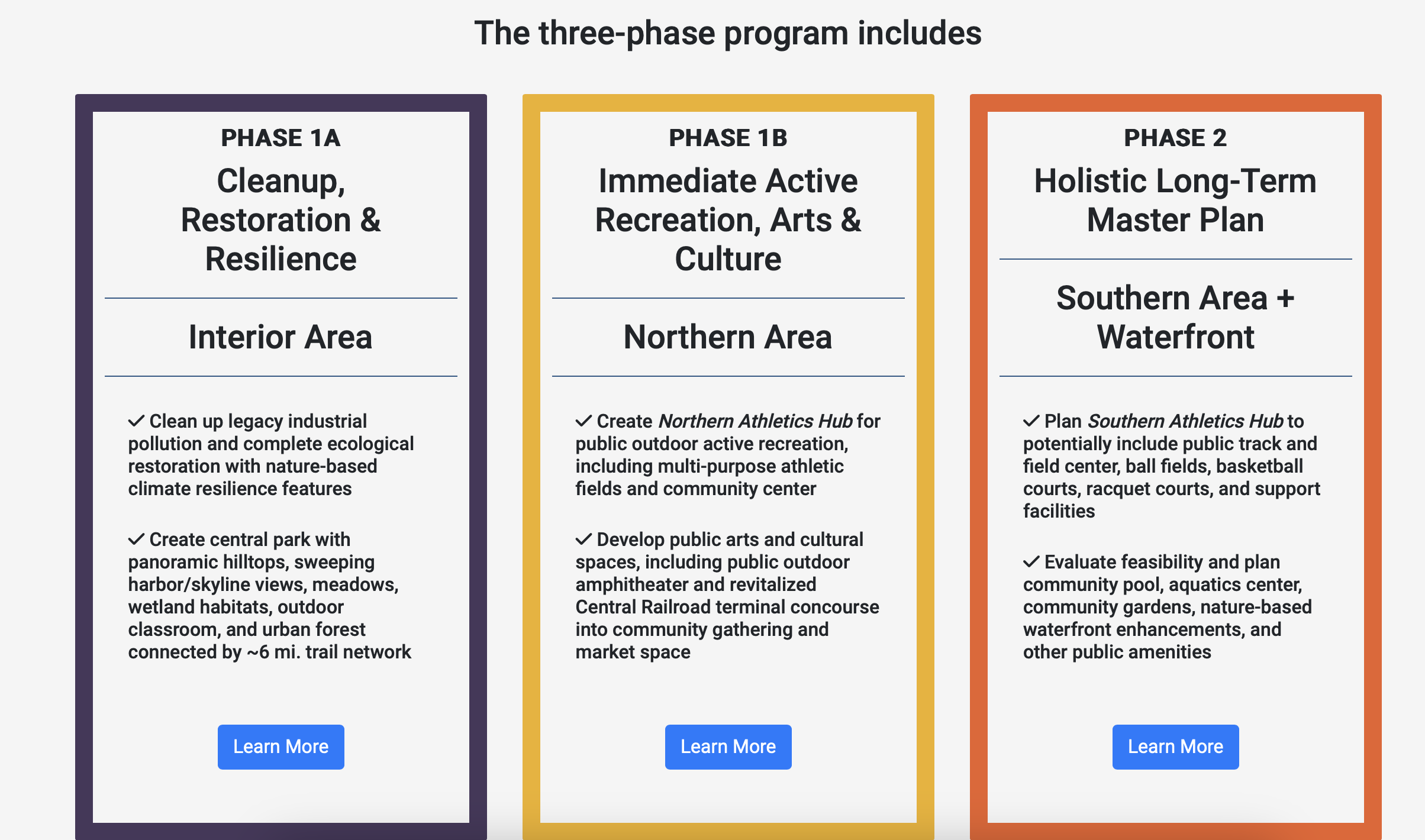 The revitalization program consists of three phases. Phase 1A, which is its current state for the Interior Area and titled “Cleanup, Restoration & Resilience”; Phase 1B for the Northern Area called “Immediate Active Recreation, Arts & Culture”; and Phase 2 for the Southern area and Long-Term Plan “Holistic Long-Term Master Plan.”