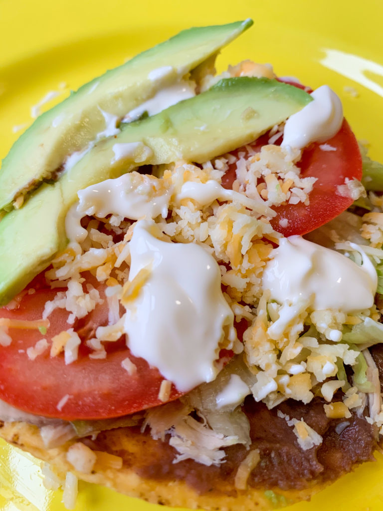 The best part of the dish is that it’s easy to substitute ingredients or add as many toppings as you’d like. The tostada corn shell can be store bought or you can easily bake or fry your own tostada tortilla.