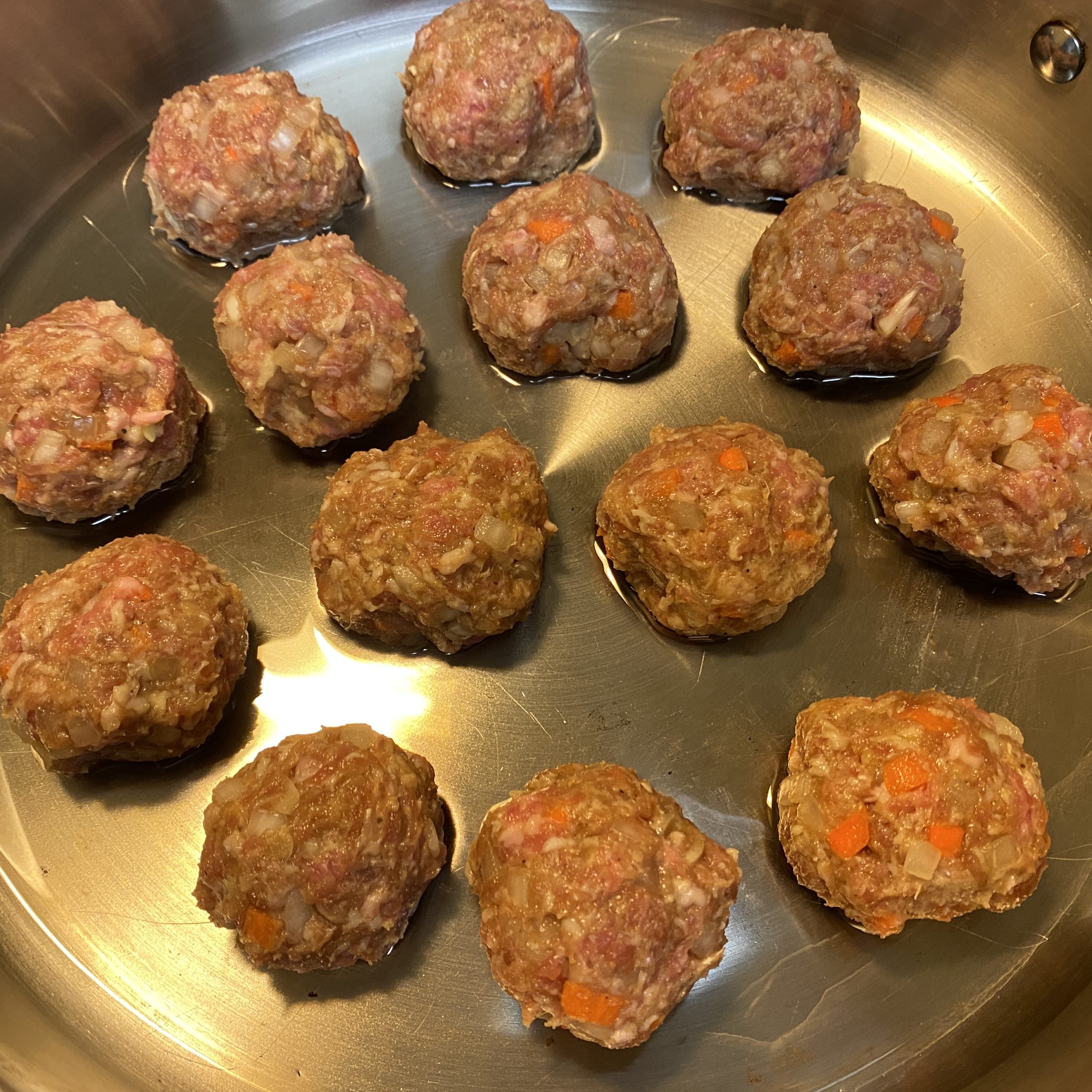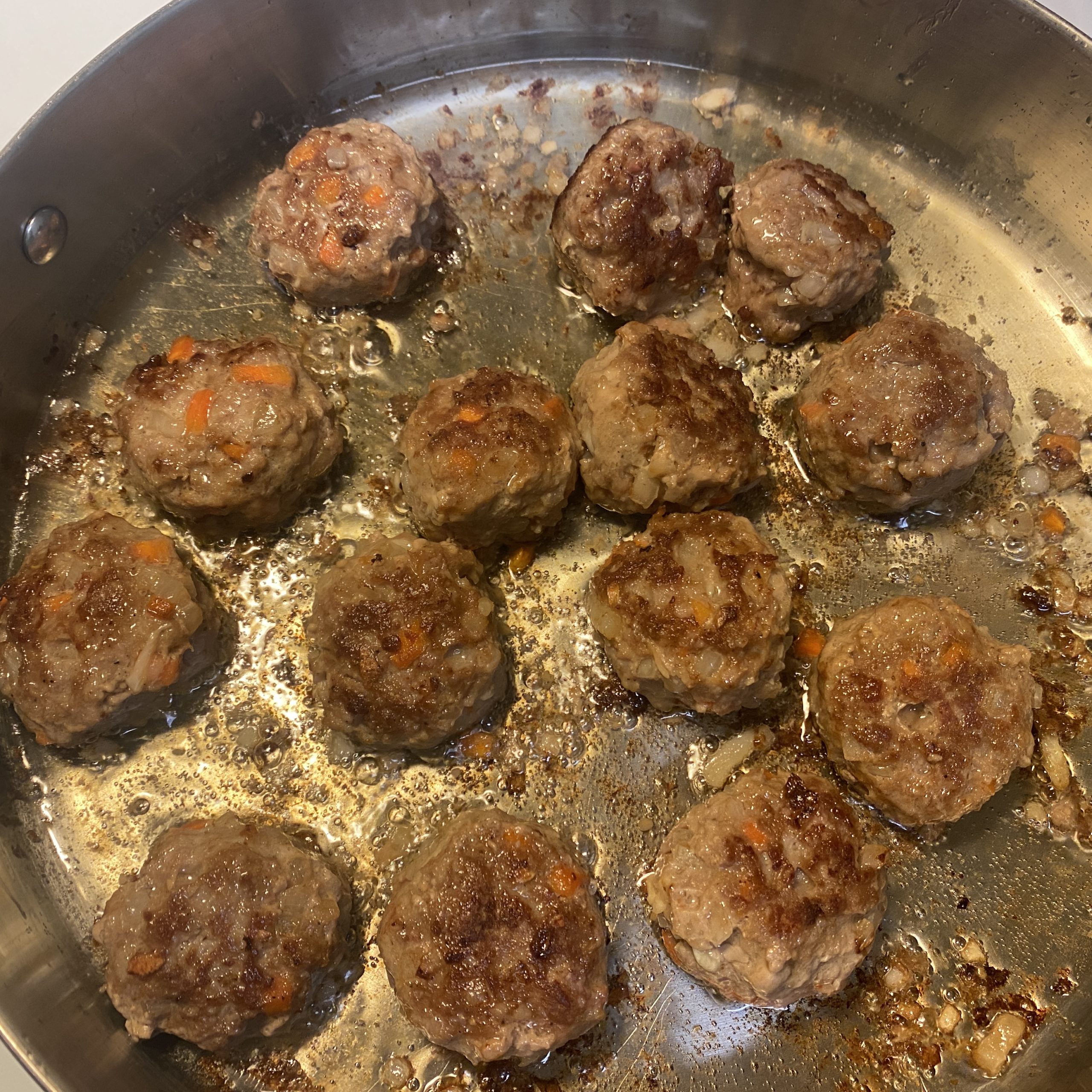 - In a large pan, add about 1/2 inch of oil to coat. Once the oil is ready, add in your meatballs (be sure not to overcrowd the pan! I fried them in two batches).