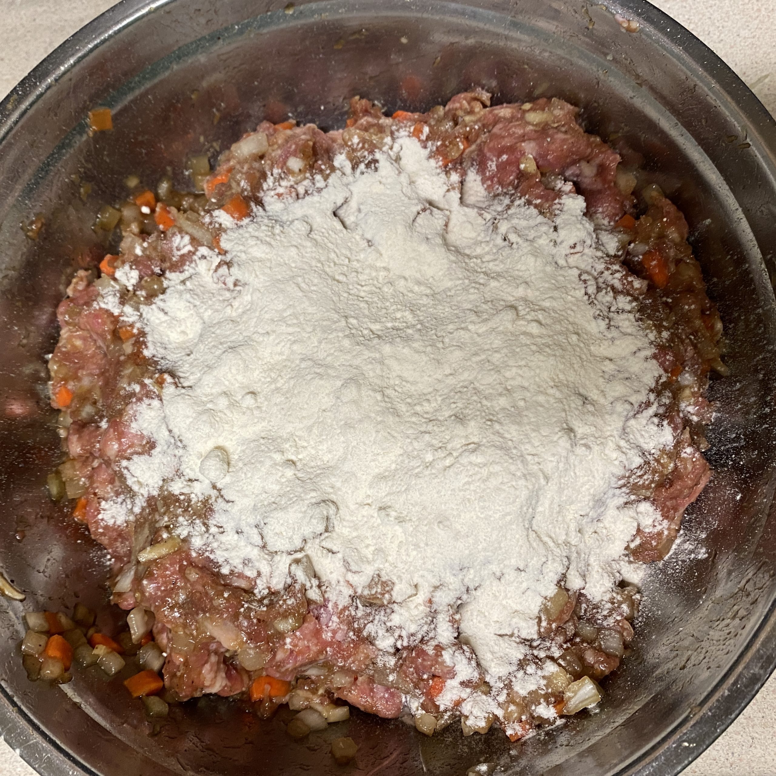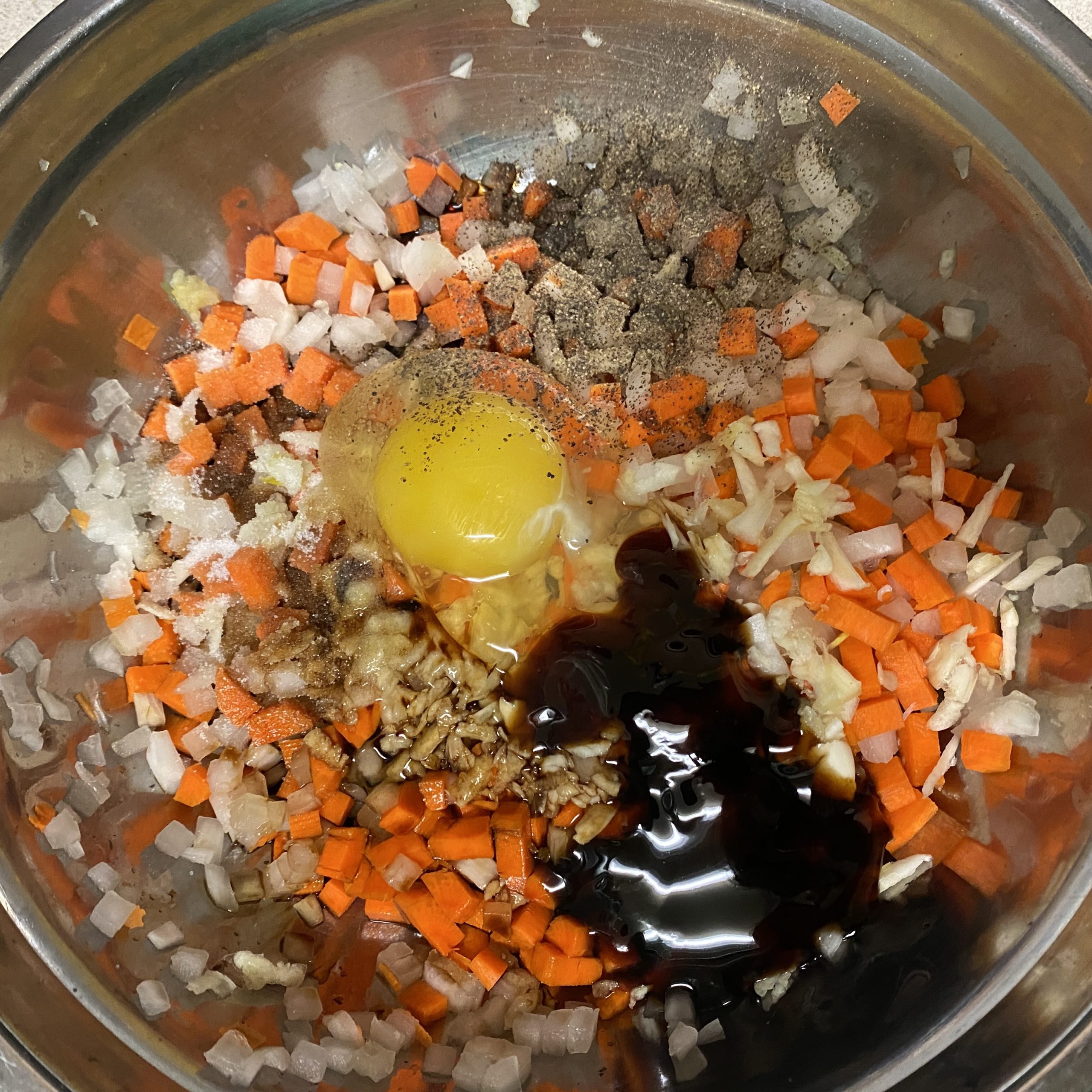 - In a bowl, place all your vegetables. Add the egg, oyster sauce, soy sauce and seasoning. Mix thoroughly.