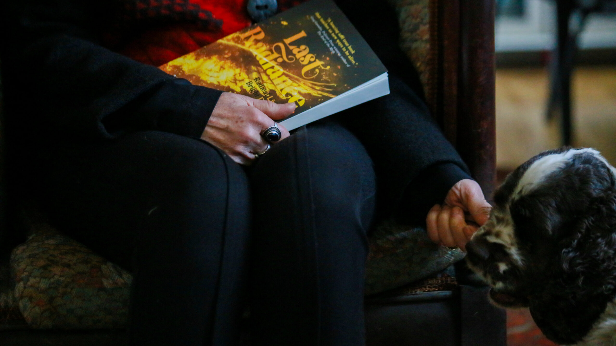 The shivers were only overcome by curiosity as I waited for the renowned author. In the back of my mind, I was thinking of the uncertainty of meeting a person and how their written works would compare to their actuality. This thought was interrupted with the audible scampering of paws and a bark. I was then greeted by the focus of my article: Karen Malpede. I was not cured of my frigid sensations. But I did start to feel warmth.