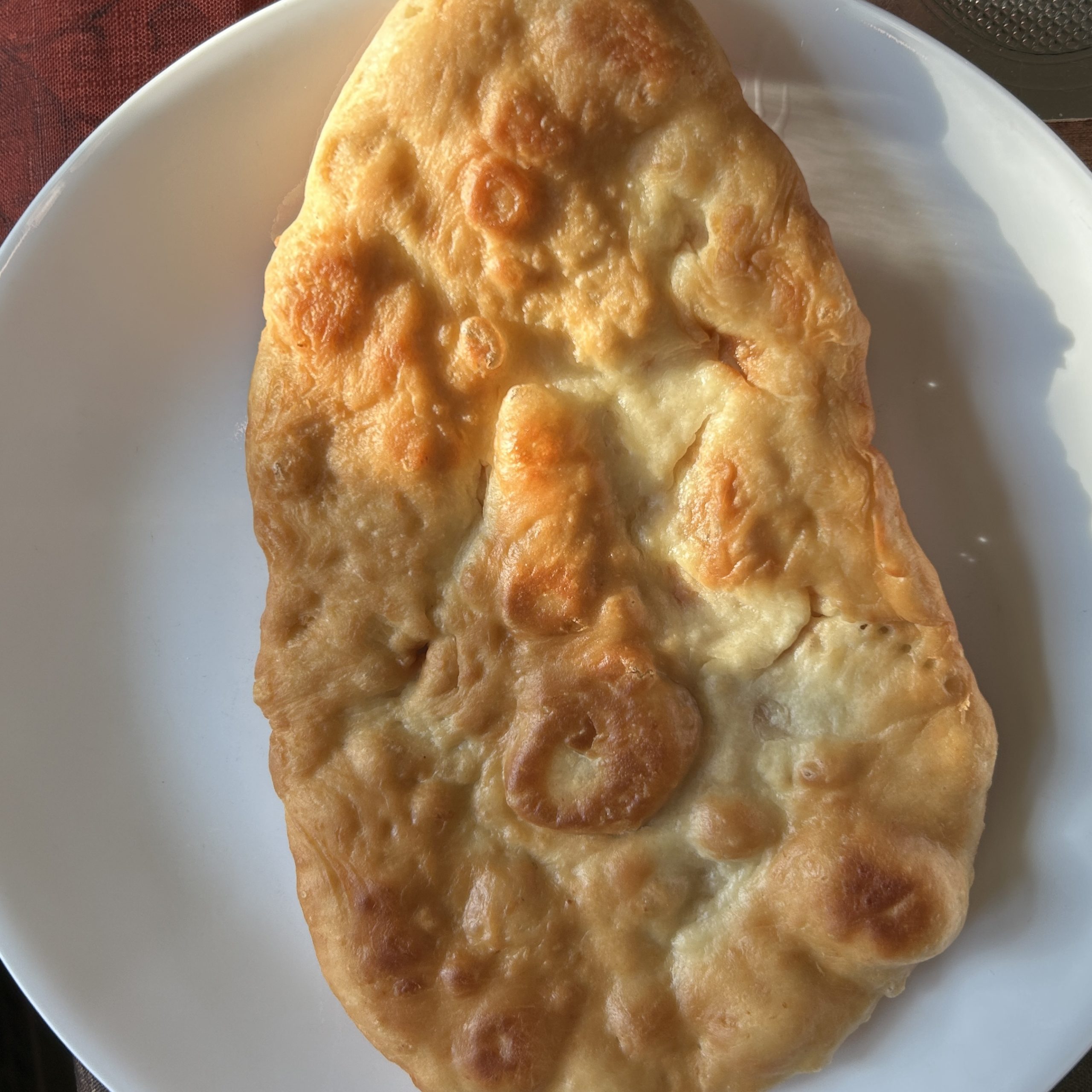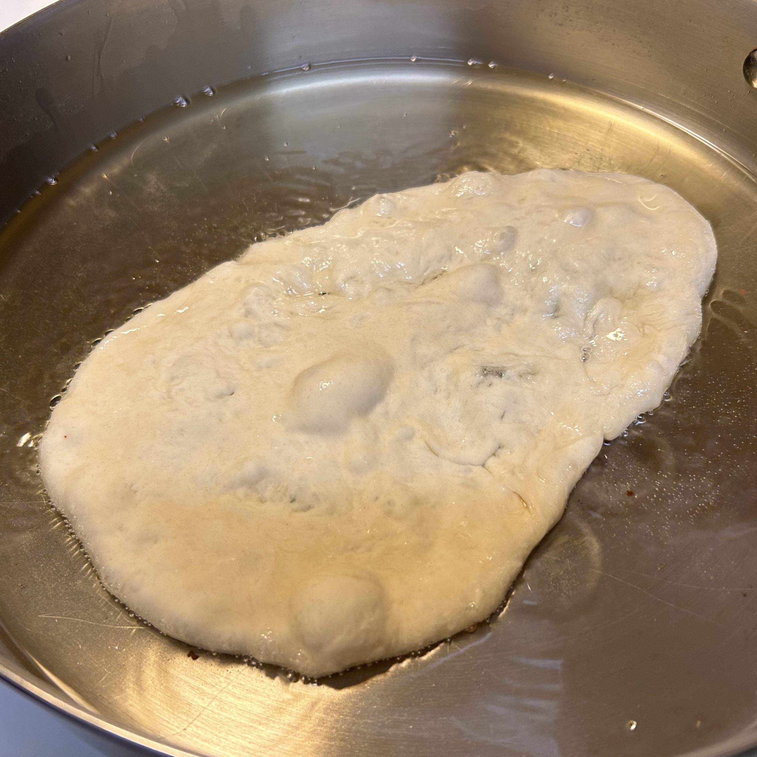 8. When the oil is ready, add the fry bread and allow to brown on both sides, about 2 minutes per side. Repeat with remaining dough balls.
