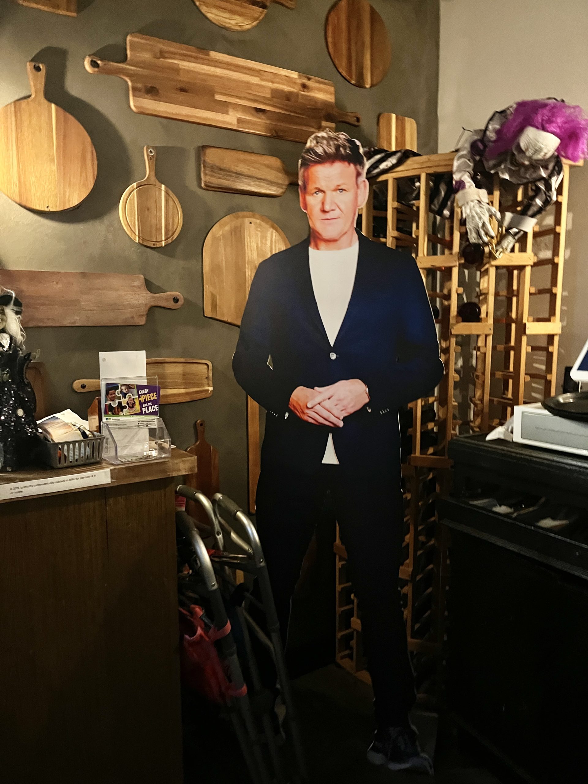 I reserved a table for my boyfriend and I via Yelp for 7 p.m. on Saturday, Oct. 21. Upon entering the restaurant, you first see the fresh modern designs of the wooden cutting boards on the wall that Ramsay’s team renovated over the former graffiti “monstrosity” on the show. You can spot an honorable cardboard cut-out of the fiery chef himself in the corner.
