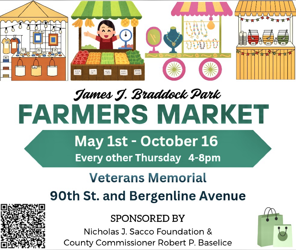 The Farmers Market, which is sponsored by the Nicholas J. Sacco Foundation and County Commissioner Robert Baselice, will take place every other Thursday from 4 p.m. to 8 p.m. at the Veterans Memorial located near 90th Street and Bergenline Avenue.