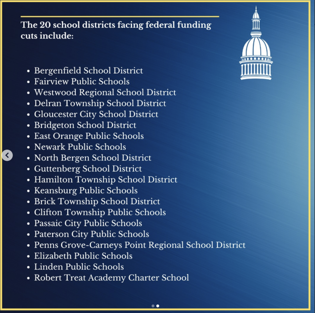 New Jersey is facing another federal funding cut via the Trump Administration. There are two Hudson County districts affected by the most recent cut: North Bergen and Guttenberg.