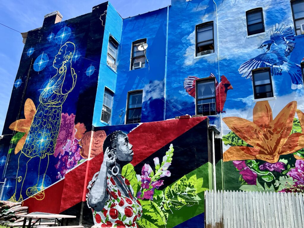 At the bottom, or foundation, of the mural, there’s a black-and-white figure with Pan-African colors behind it, symbolizing the woman’s ancestry and past. On the right side, there’s a larger, vibrant figure wearing a red, white and blue dress, which Wright explained was another version of the Statue of Liberty, but illustrated as an everyday person. Beside that are a cardinal, blue jay and blue sky to further follow the red, white and blue theme and flowers that reference the community garden that’s below.