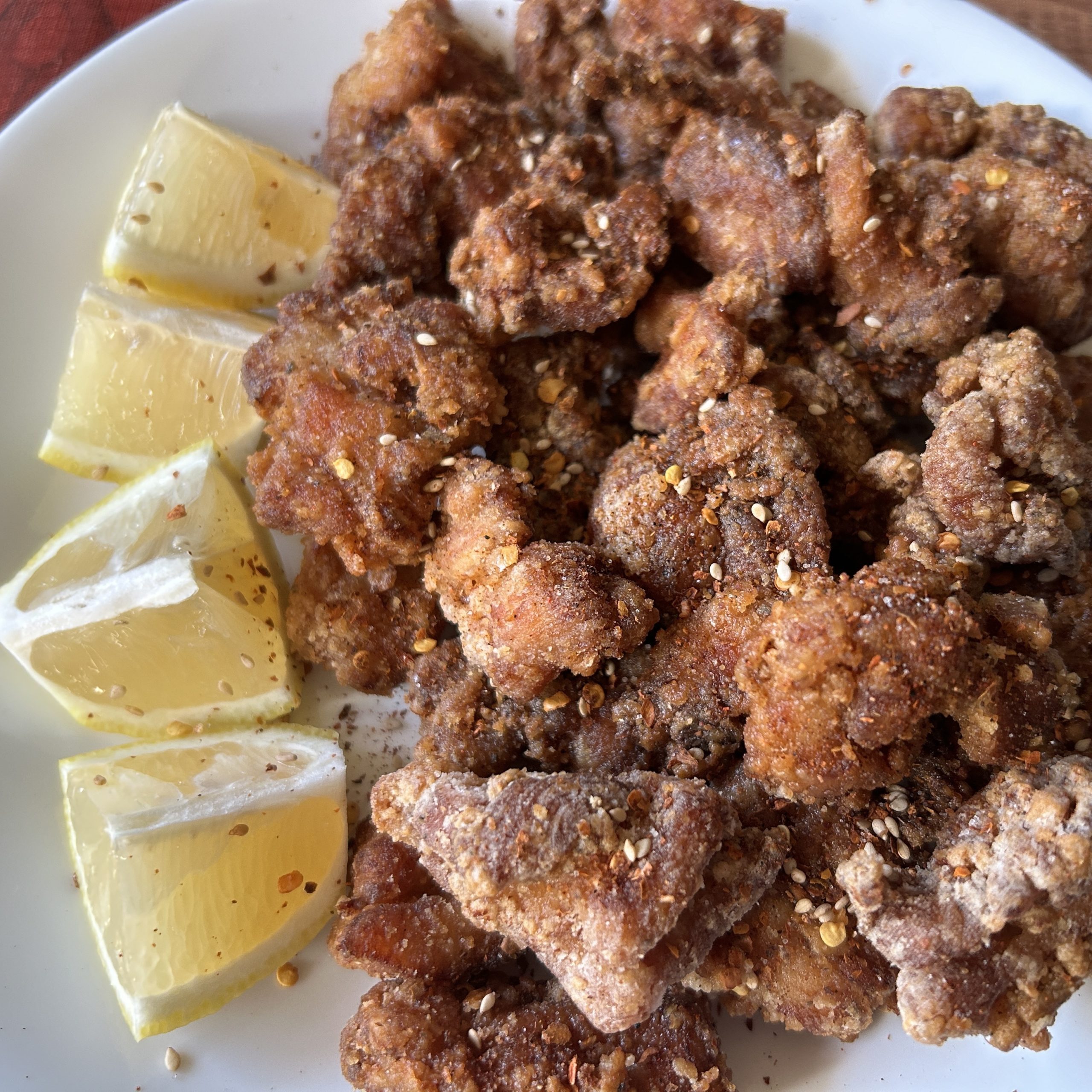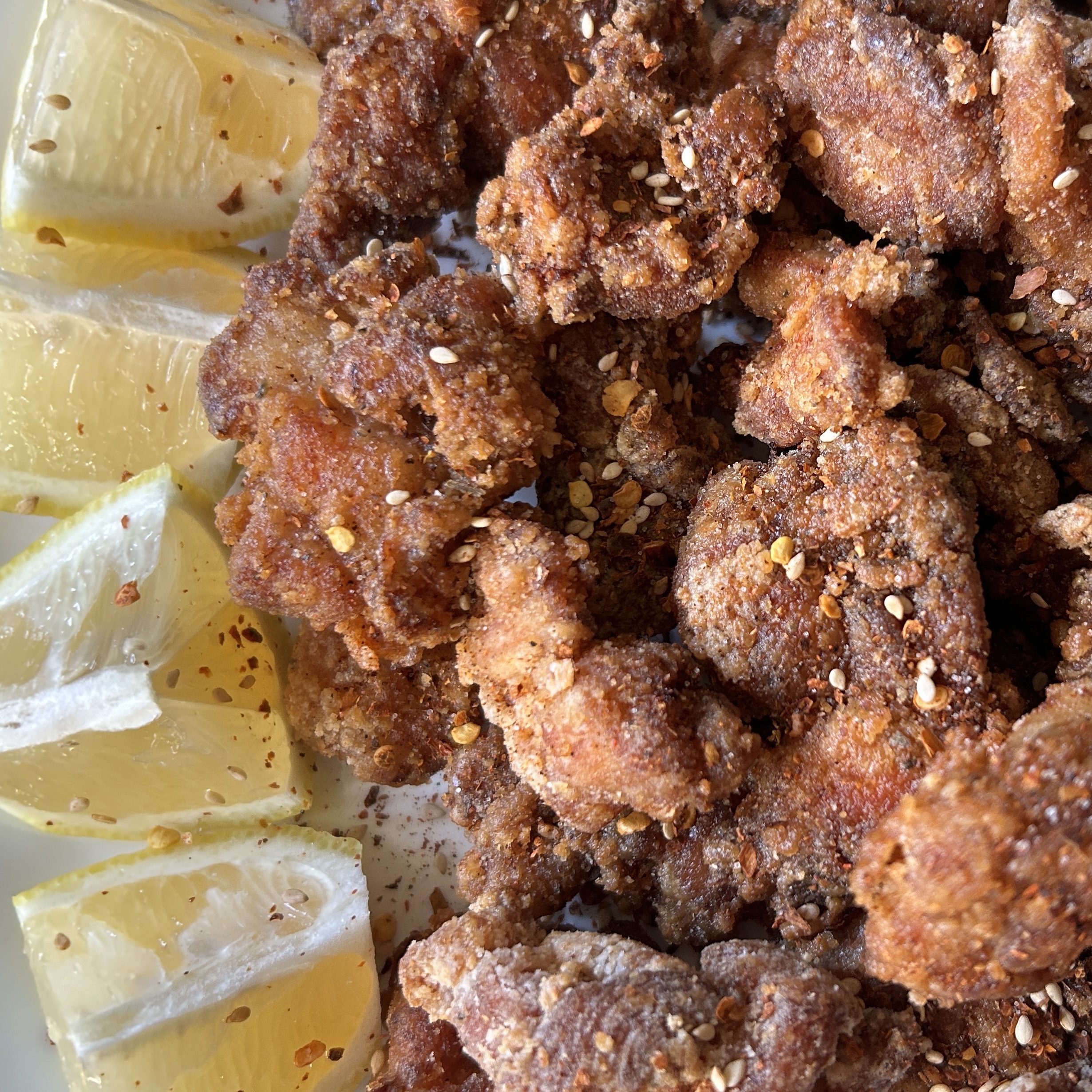 6. When all the chicken is done, coat with the seven spice blend and serve with lemon and kewpie mayo.