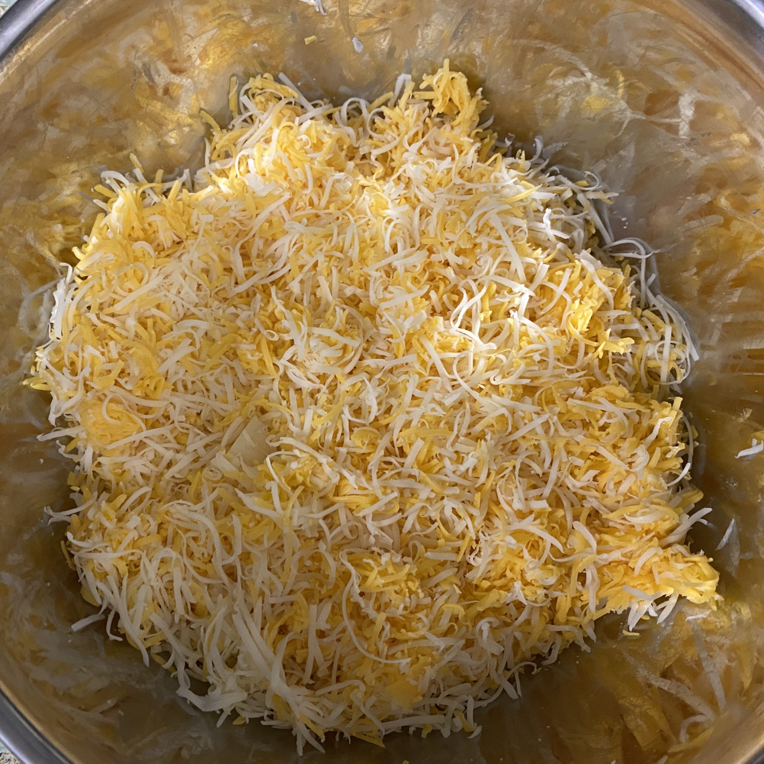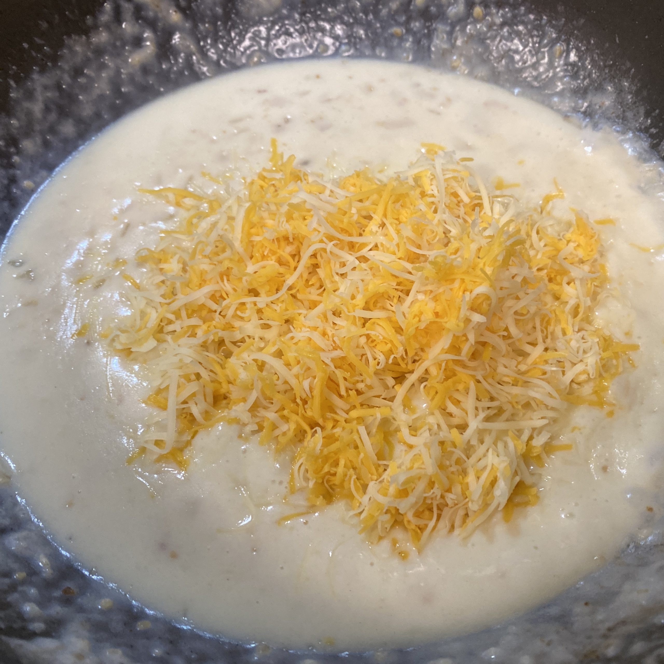 - Add flour and mix. Gradually add your milk, stirring while mixing it in. Next, add your cheese and mix until fully incorporated.