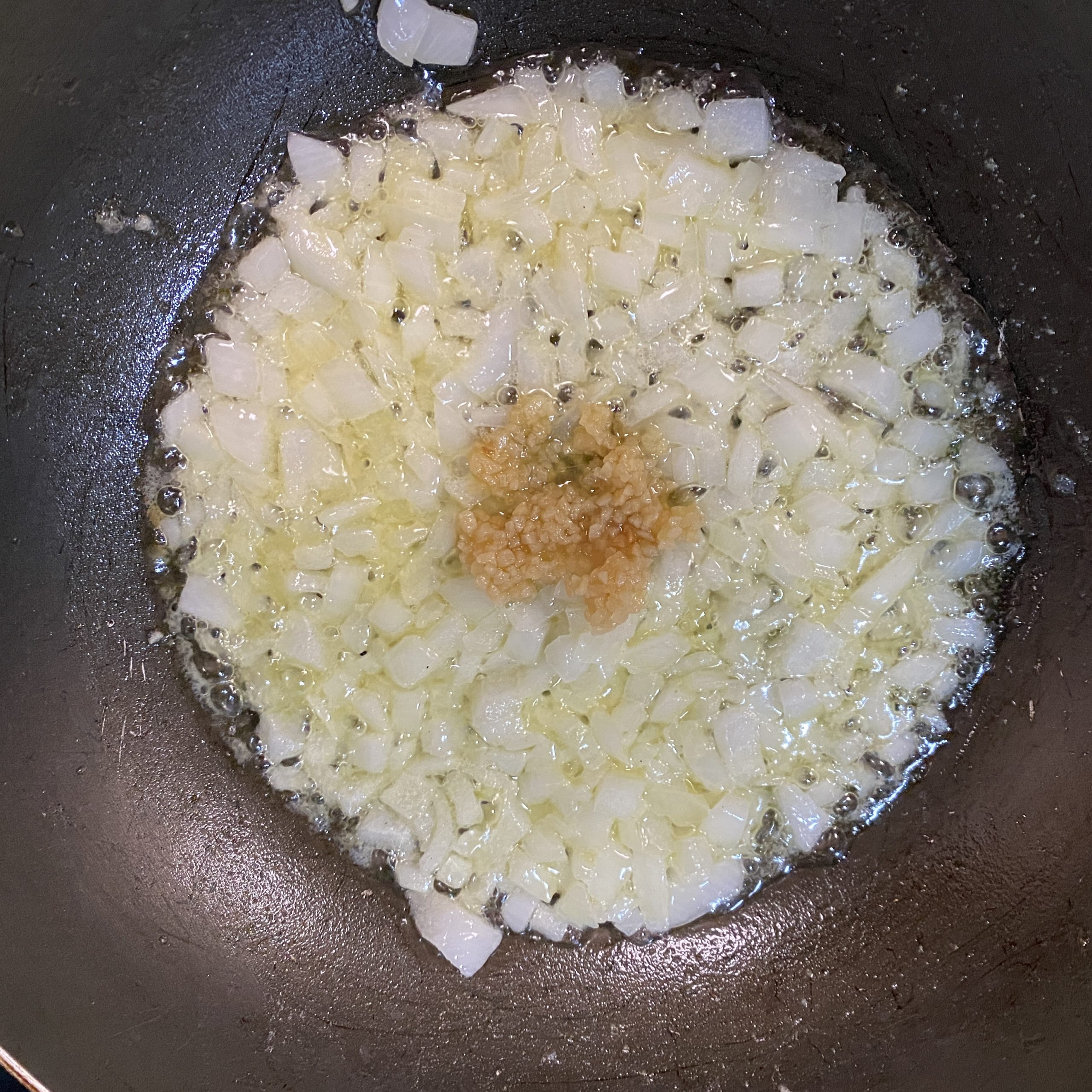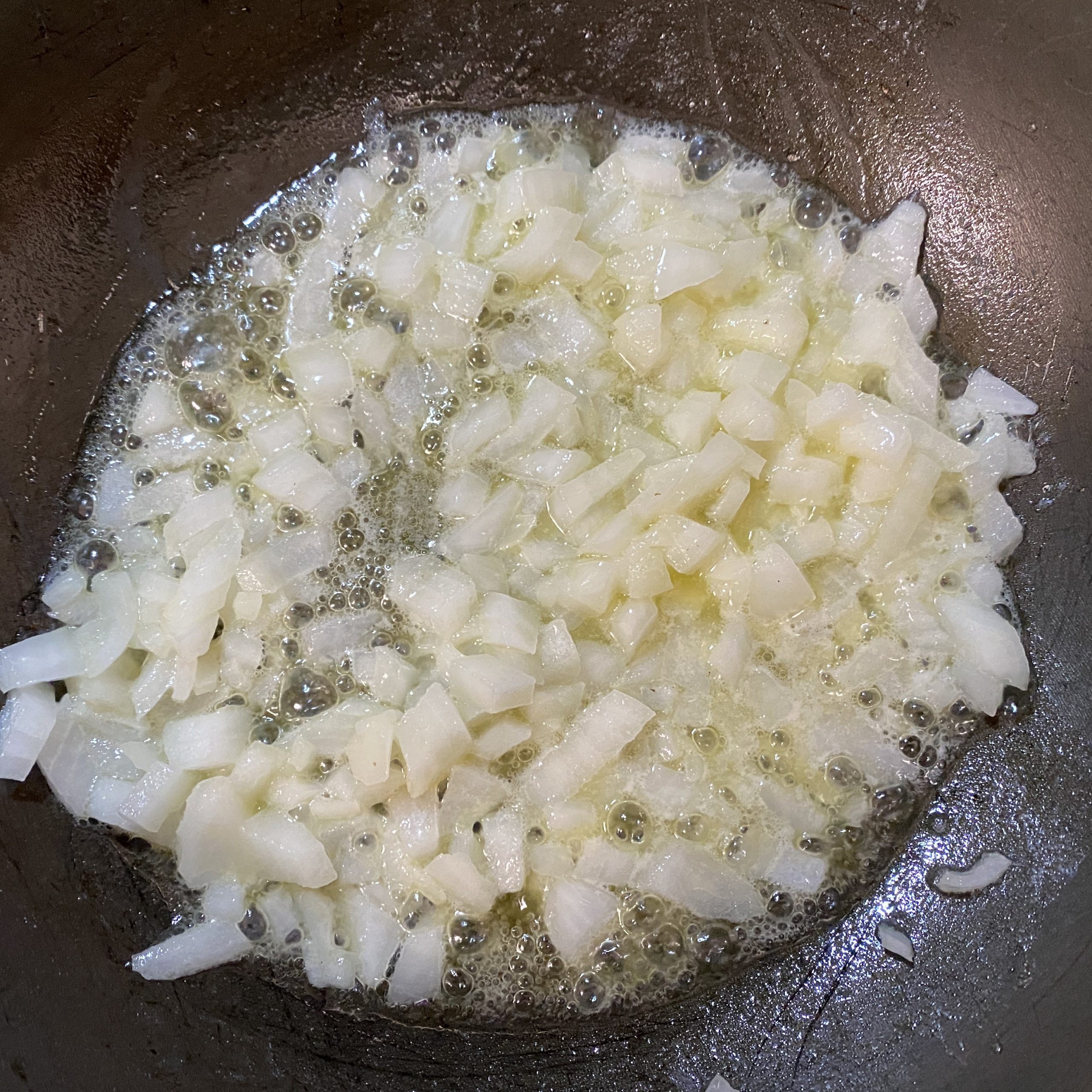 - In a pan over medium heat, add butter. Let melt and add onions. Cook until soft, about 5 minutes. Add garlic and sauté until fragrant, about 1 minute.