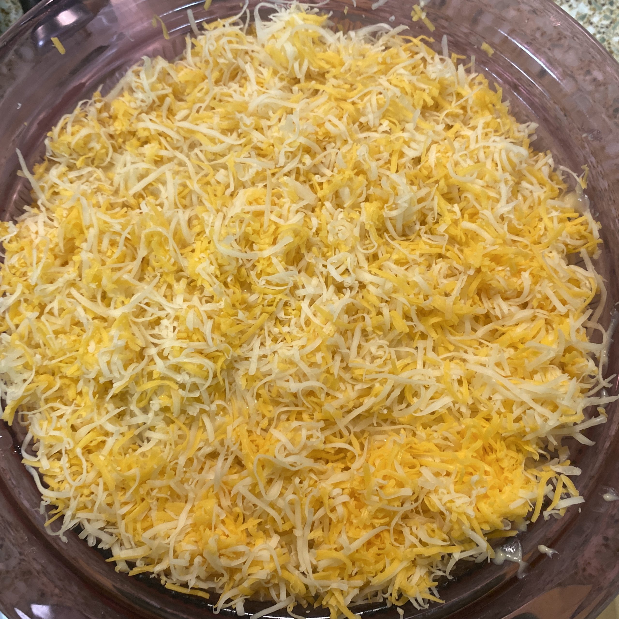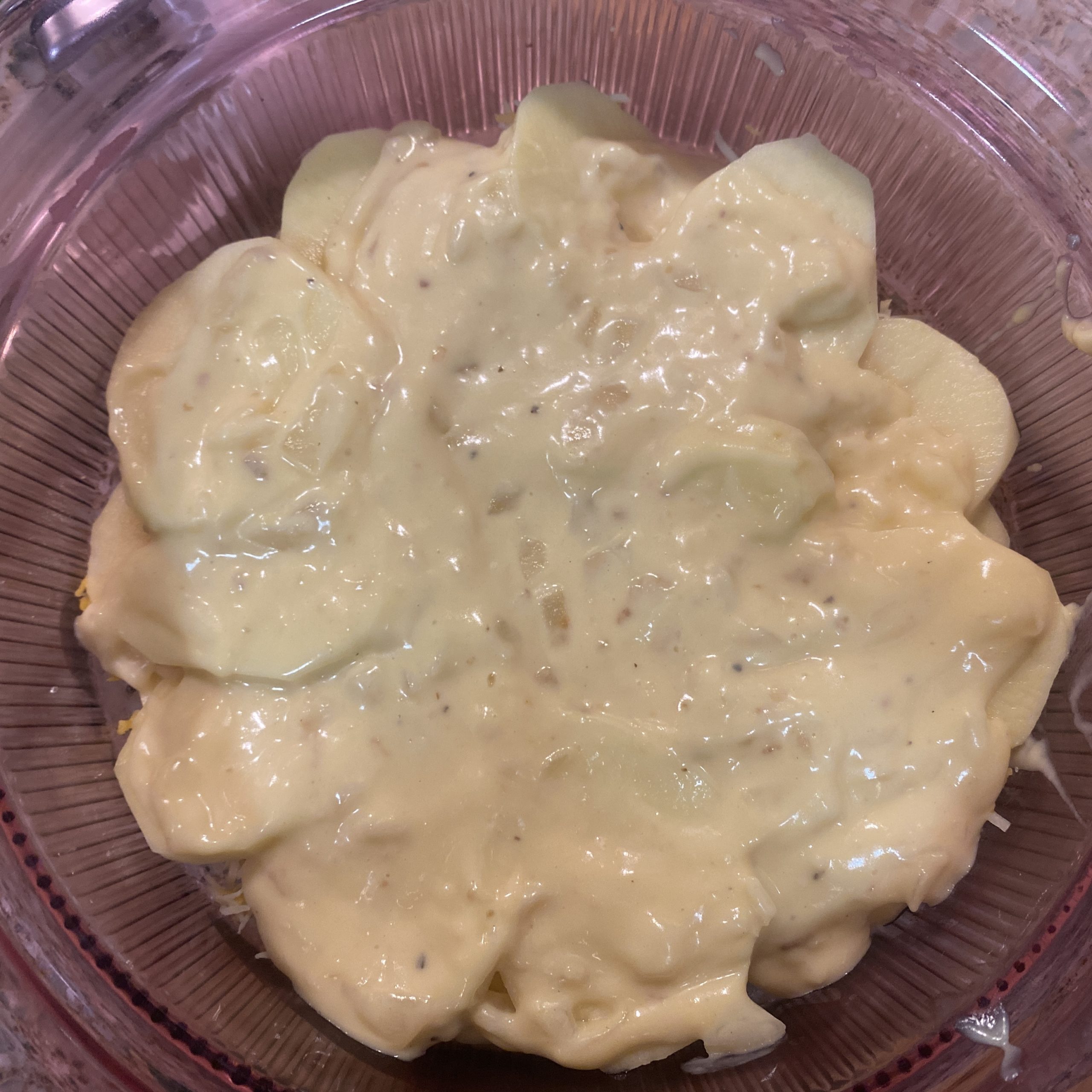 - Now, it’s time to layer. In a baking dish, layer your potatoes to fill up the bottom of the dish, add the cheese sauce and make sure it completely covers the potatoes. Add grated cheese.