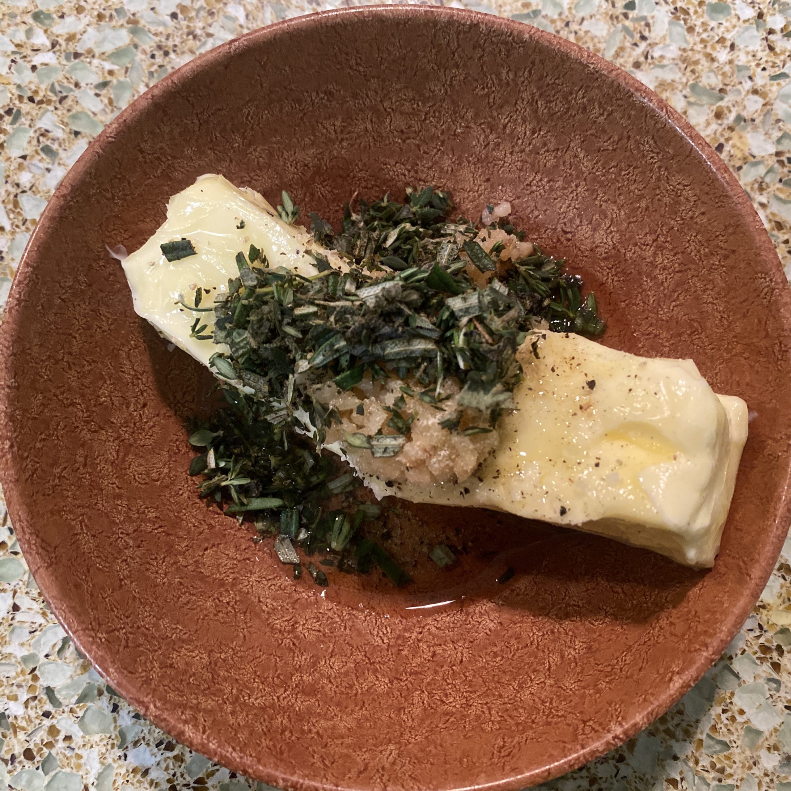 - In a small bowl, combine the butter with all the spices. Add the olive oil and mix until fully incorporated.