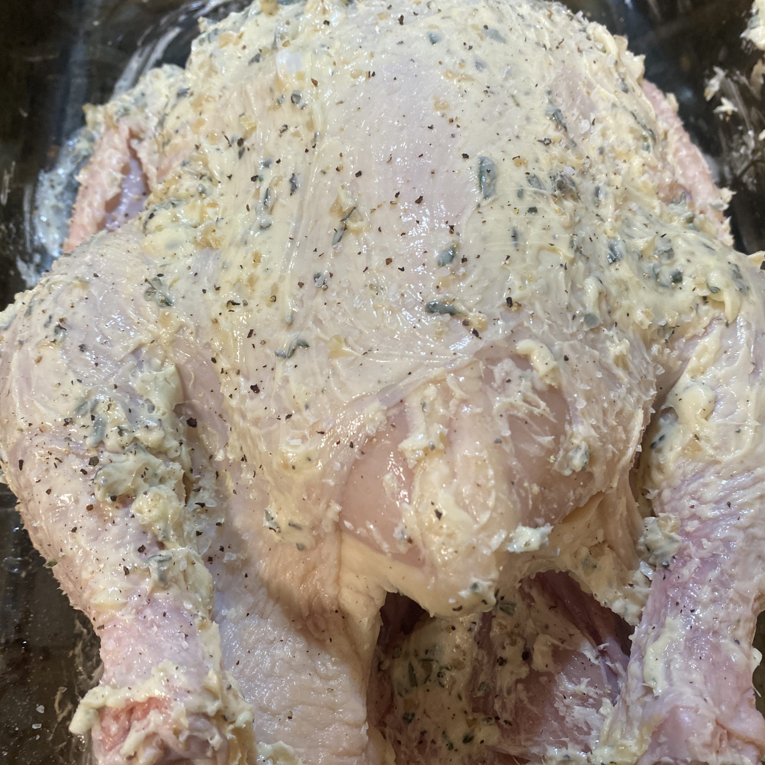 - Take the butter mixture and stuff the underside of the skin with it. Then, spread the butter all over the chicken, making sure to cover all of the crevices.