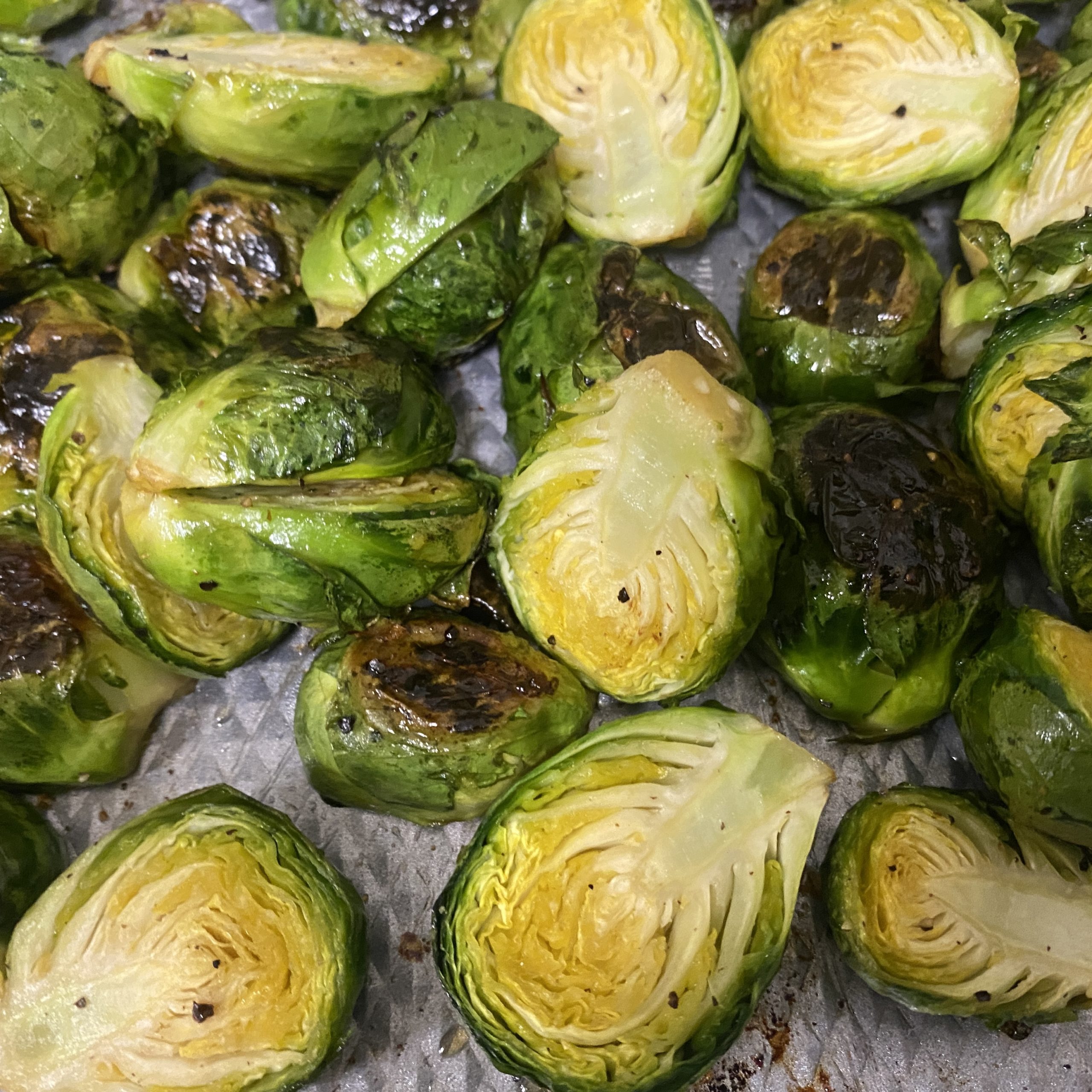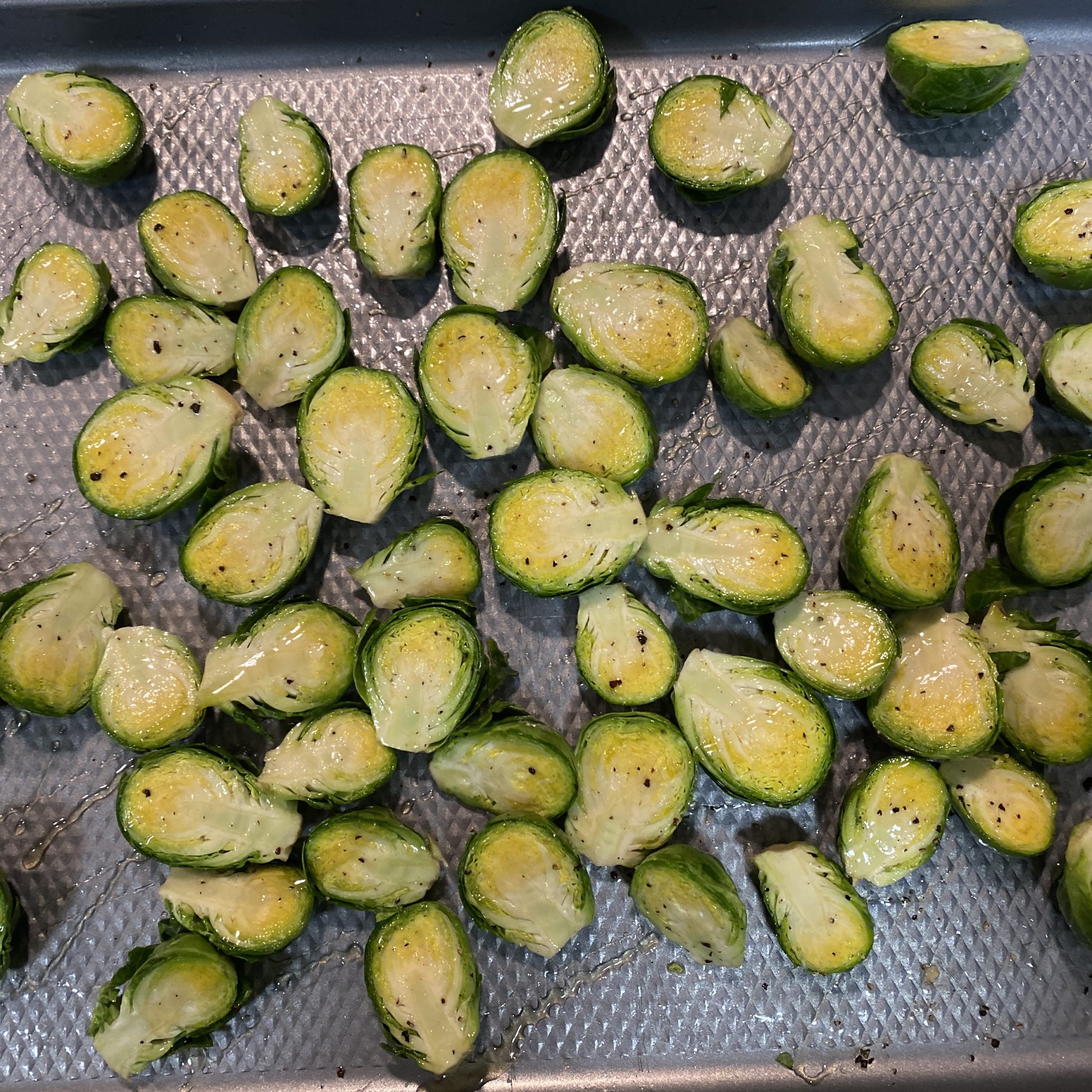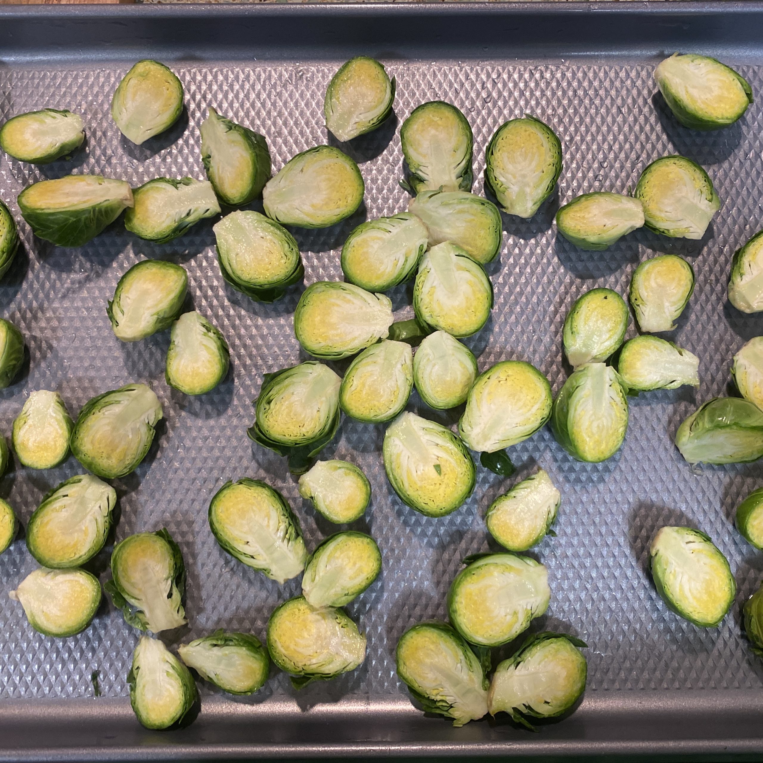 - On a flat sheet pan, evenly arrange the brussel sprouts.