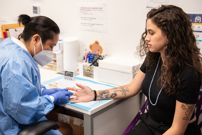 HIV Testing Coordinator performs an HIV test on Client Services Navigator Karla Oliva at the Hudson Pride Center in Jersey City. (Photo courtesy of Reena Rose Sibayan / The Jersey Journal.)