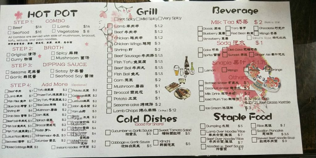 The menu offers the Hot pot, grilled meats, a variety of different flavored dumplings, noodles, cold dishes and bubble teas.