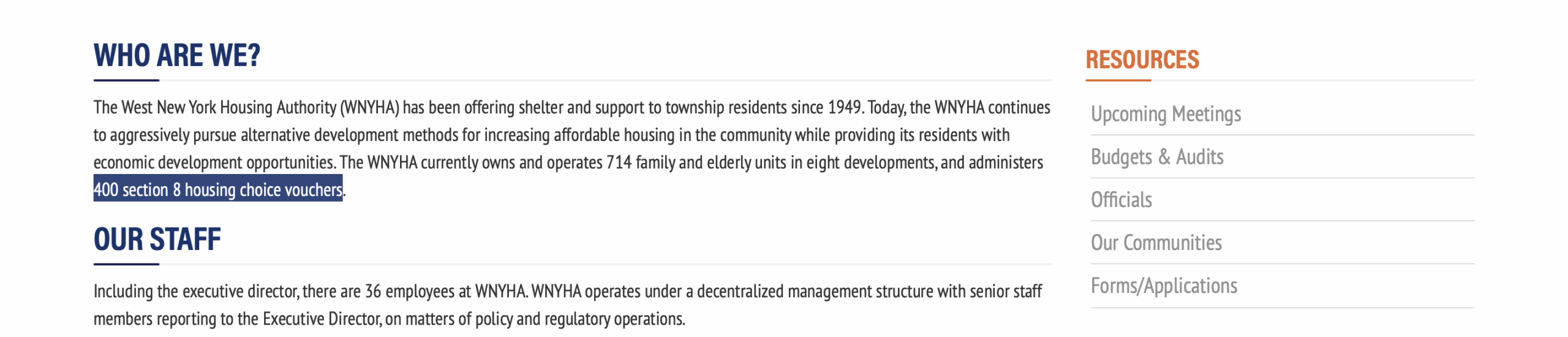 Another option for residents who are low-income or in poverty is to apply for a Section 8 voucher. West New York Housing Authority currently displays that they administer 400 vouchers on their welcome page, but claim it is “over 400” in the “WNYHA in Numbers: Fast Facts Section.” Slice of Culture called the Section 8 department and the Director’s Office through the number provided on the WNYHA website to confirm the correct amount, but no calls were returned at the time of writing.