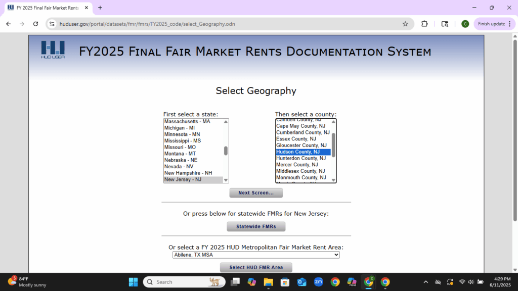 Fair Market Rent, or FMR, is a rate or term used by the U.S. Department of Housing and Urban Development to determine “reasonable” or modest rent for an area. To find your zip code’s FMR, log on to the huduser.gov portal, select New Jersey in the states column and then select “Hudson County” in the counties column. After clicking “Next Screen…,” all of the county’s zip codes are available in a table with their respective FMRs.